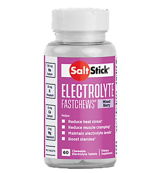 SaltStick provides a variety of fast-absorbing electrolyte supplements, including Fastchews, Electrolyte Fastchews, and Capsules. These products help restore electrolytes lost through sweat.